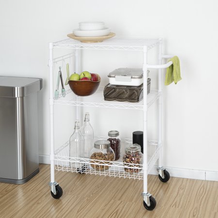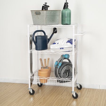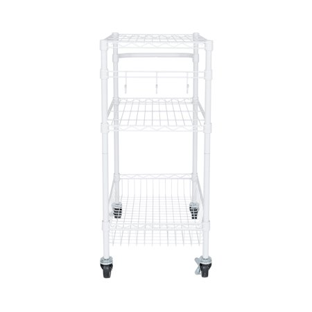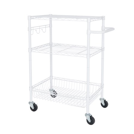 Hyper Tough 3 Tier New Multi-Purpose Rolling Cart in White is an easy assembly item with no tools required. It offers you versatile storage solutions for your kitchen, laundry room, garage, office etc. Its wire shelves and basket are adjustable in 1 inch increments. Four durable casters allow you to wheel the cart from one room to another with ease. .The total load capacity on casters is up to 495 lbs per unit when evenly distributed. NSF certified for dry storage. Perfect storage unit with flexible mobility.