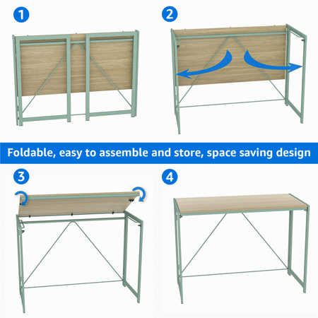 Mainstays Sage Frame Folding Desk with Natural Grained Top,Adult Specifications product size: 40.55”L x 19.69”W x 29.25”H Weight: 22.8 lb Materials Strong steel frame MDF board Sage green frame +Natural top Everything you need is efficiently packed into one box and shipped straight to your door Folding Desk - SIMPLEST INSTALLATION - 8 seconds to complete. When not in use can be folded in the corner, save space; Also convenient to carry when going out for a picnic. APPLICABLE ROOM AND FUNCTION : Suitable for study, bedroom, living room, kitchen, children's room, office. Can be a computer desk, learning tables, game tables, picnic tables,secretarial desk. Package Includes: 1 x Table Frame 1 x Instruction Set Finish Type: Powder Coated MDF board:39.17in*19.68in*0.59in