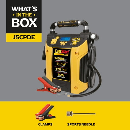 The EverStart Maxx J5CPDE Jump Starter/Power Station is the perfect companion for all roadside emergencies and personal power needs. Delivering 1400 peak battery amps through integrated jumper cables, it has got enough power to start most vehicles (up to and including V8-powered cars and trucks). It's also got a powerful 500-watt inverter and high-output triple USB power ports for all your electronic devices. just connect the Sure Fit nozzle from the Power Station's compressor, select your desired pressure, and let the Power Station do the rest. New.