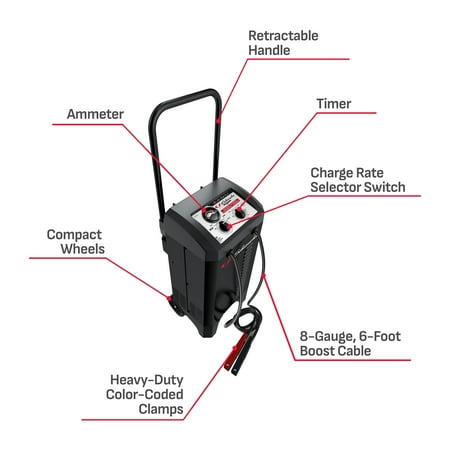 A reliable manual wheeled battery charger with substantial starting power is essential for any serious home garage. The Schumacher Electric SC1437 2-in-1 12-Volt Manual Wheeled 6-Amp Battery Charger and 150-Amp Engine Starter fills this role perfectly. While automatic chargers may be suitable for some individuals, others prefer full control over the charging process to ensure precision. The SC1437 offers this control, enabling users to set the timer and amperage while monitoring progress on the amp meter. Constructed with a sturdy metal case, this charger is designed to resist damage and endure heavy usage. Its retractable handle and compact wheels provide a smaller footprint, making it ideal for garages with limited storage space. With its robust performance, exceptional design, and long-lasting durability, the Schumacher Electric SC1437 emerges as the superior option for battery charging and starting.