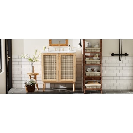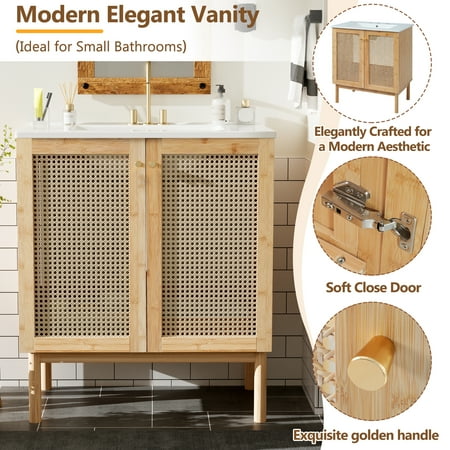 Elevate your daily routine with the 30-Inch Natural Bamboo Bathroom Vanity with Ceramic Sink , Handmade woven material doors, soft-close hinges, elegant gold accents, and ample storage. This freestanding vanity is a true masterpiece of natural bamboo craftsmanship, designed to transform your bathroom into a sanctuary of design and function. The warm tones of the solid wood seamlessly blend with artisanal handwoven woven material doors and sleek zinc alloy gold handles for a minimalist yet sophisticated aesthetic. Featuring a highly durable, easy-to-clean ceramic basin with overflow guard, it effortlessly combines beauty with practicality. Keep your bathroom completely clutter-free thanks to the generous internal storage, while the quiet soft-close cabinet doors preserve a peaceful atmosphere. Perfect for modern bathroom upgrades, this compact, space-saving vanity ensures lasting stability and timeless elegance.