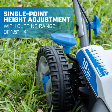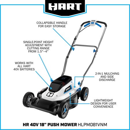Tired of grass getting stuck under the deck of your mower? Also tired of cleaning blades? If so, then you should consider this electric 40V 18” Side Discharge Mower. It features a side-discharge chute that evenly disperses grass clippings onto the lawn. (Which, by the way, is great for your lawn.) Our lightweight, cordless unit also mulches too. The addition of a single point height adjust makes it easy to tackle mowing of various grass heights from 1-1/2""-4"". Also goodbye to annoying pull cords. This battery-powered machine starts with just the push of a button—and cuts up to 1/4 of an acre on one charge. Works with All HART 40V Batteries. Includes: 40V 18” Side Discharge Mower, 6.0Ah battery, charger, side-discharge chute, start key, mulch plug and operator’s manuals.