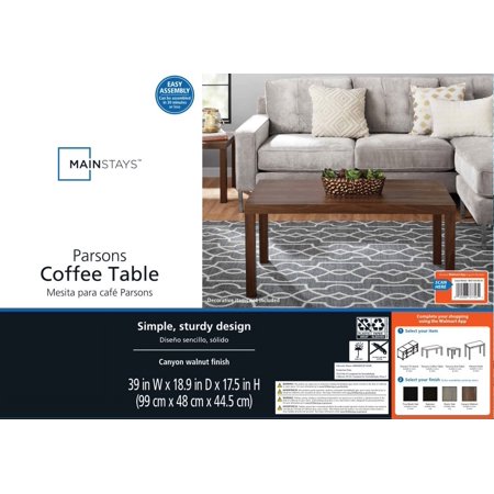 Keep your essentials close by with the Mainstays Parsons Coffee Table. Made of PVC laminated hollow core, the classic walnut woodgrain finish pairs well with any style and decor. Keep your snacks, remotes, and electronics on the table top to have everything you need for a night in within reach. The minimalistic design is ideal for small spaces like dorm rooms and first apartments. The sturdy construction and water resistant finish will keep this Coffee Table looking great for years to come. The Coffee Table ships flat to your door and requires minimal assembly upon opening. Simply attach the 4 legs to begin using. Once assembled, the End Table measures to be 17.5"H x 39"W x 19"D.