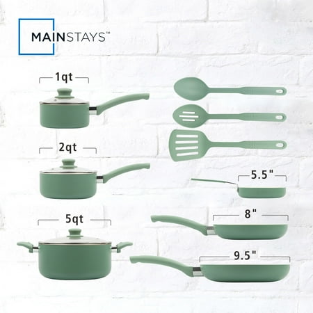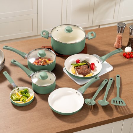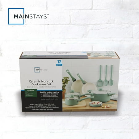 Ideal for everyday use at home, this Mainstays ceramic 12 pieces set green sage includes pans and kitchen utensils that can fulfill your everyday cooking needs at home. It is also ideal as a considerate and valuable gift to your close friends and family. The interior is coated with 2 layers of PPG Customized ceramic coating, which makes cooking and clean-up easy. The pans heat quickly and evenly due to the aluminum body, so this set will help you save time cooking as well. Cool, soft-touch handles provide a comfortable grip, while the outside color of this set will offer a bright pop of color to your kitchen.