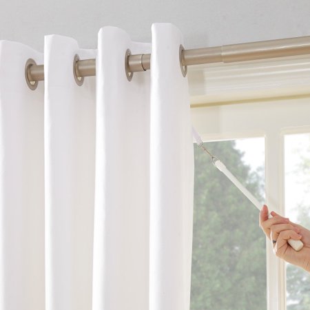 The Mainstays Energy Efficient Extra Wide Sliding Glass Door curtain panel is perfect for large windows and patio doors. The solid design with an easy to hang grommet-top offers a classic style that fits in with any room decor while reducing noise for better sleep; help keep your home cooler in the summer and warmer in the winter. The Blackout panel is thermal-backed and made of materials that block light and darken the room. The darker the color, the better the light reducing capabilities. Each curtain is sold individually. Hang on a curtain rod up to 1.5-inches in diameter.