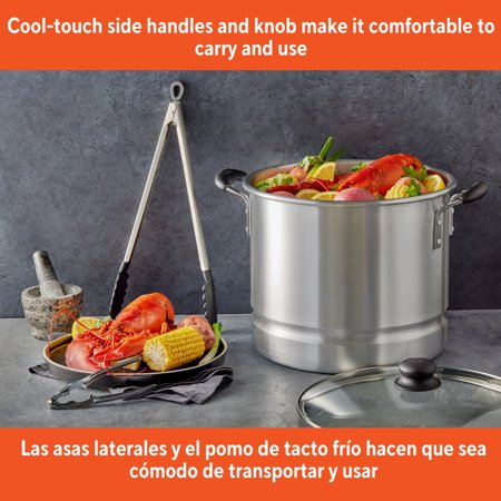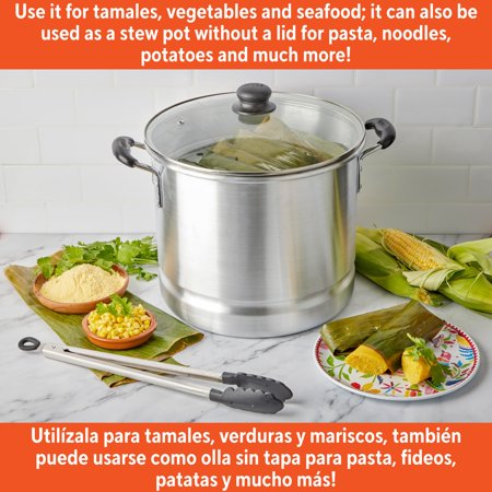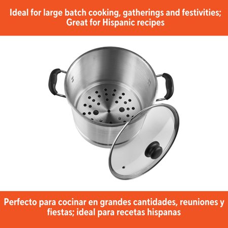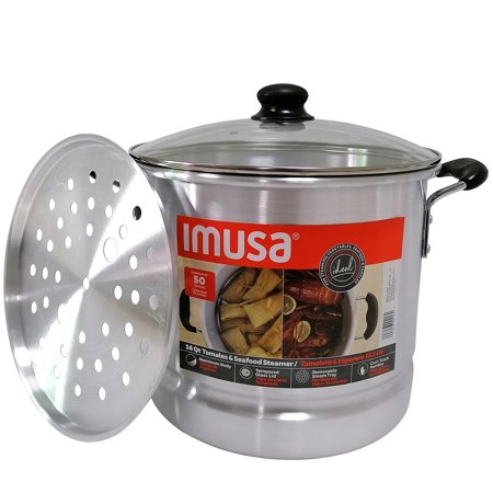 The IMUSA 16Qt Aluminum Steamer is an essential piece in every kitchen. This steamer is made of aluminum with a natural interior finish and polished exterior. This IMUSA cookware piece has a capacity of 20Qt. The IMUSA Aluminum Steamer includes a glass lid that keeps the heat and moisture within for perfectly cooked meals, and a removable steamer insert that adds versatility to your culinary endeavors. You can control your cooking without losing steam thanks to the convenient glass lid. Its Bakelite side handles provide a comfortable grip making it convenient to transport from the kitchen to the table. With this versatile piece, you can cook a variety of different meals. Whether preparing tamales, vegetables, or seafood, the IMUSA Aluminum Steamer excels. Use it without the insert for cooking pasta, noodles, potatoes, and more. Its adaptability extends beyond the kitchen, as it seamlessly transitions to outdoor cooking. Trust the IMUSA Aluminum Steamer for balanced, home-cooked meals. It will surely become your kitchen's beloved companion, uniting tradition, and innovation in every delectable creation and elevating your culinary experience.