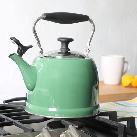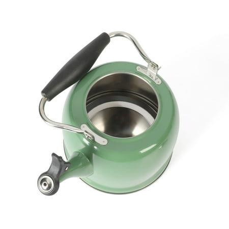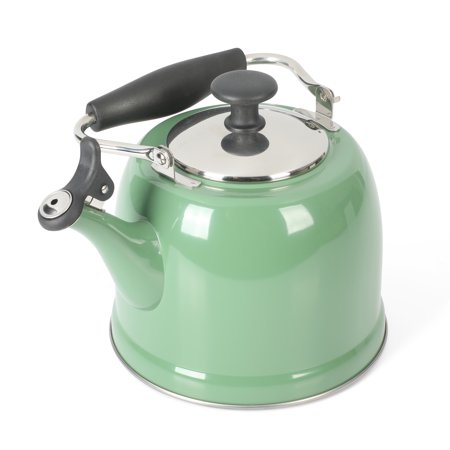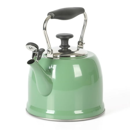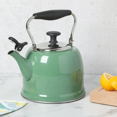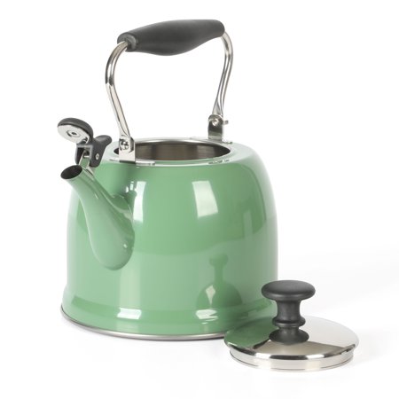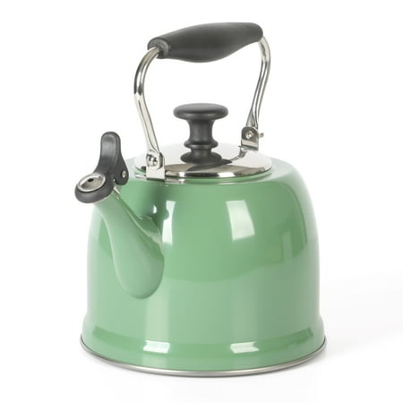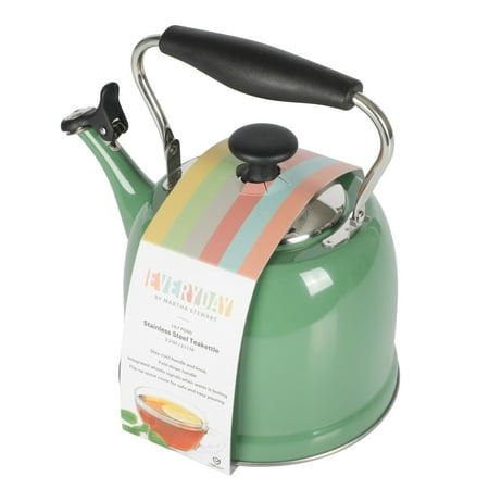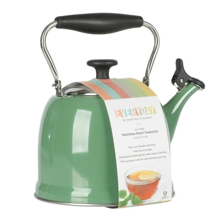 Keep hot water ready and within reach when cooking. The Everyday by Martha Stewart Lily Pond 2.2-quart Whistling Tea Kettle prepares hot water as needed for soups and stocks or coffee and tea. Made from stainless steel, the tea kettle offers everyday durability and quick heat distribution to serve hot water on time. The glossy enamel finish elevates this classic kitchen essential as a statement stovetop centerpiece that looks good in any kitchen. The flip-up spout emits a soft whistle when the water has come to a rolling boil and is ready to serve. For easy and safe pouring, the sturdy handle provides a comfortable grip. To clean the interior, fold down the handle to reach the trickiest corners of the tea kettle. Safe to use on all stovetops, this whistling tea kettle will signal the start of midday coffee breaks or quiet tea times in the most stylish fashion. Hand wash only. Enjoy beautifully crafted kitchen and tabletop pieces that blend style and function with Everyday by Martha Stewart. Inspired by Martha's love for elevated dining and entertaining, these products are crafted for the everyday home cook who shares her passion for home-cooked meals, entertaining guests, and sharing moments with family and friends.