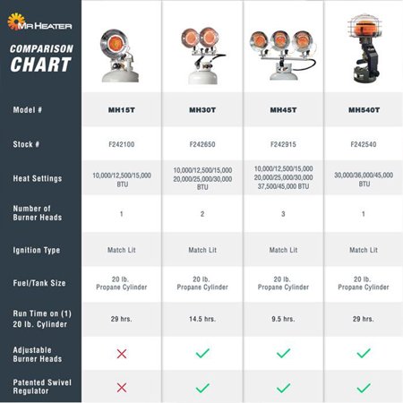 Just because you're spending time outdoors during the cold season doesn't mean you have to put up with the chill warm up any outdoor or garage space with the radiant warmth of the Mr. Heater 45,000 BTU 540 Degree Outdoor Propane Tank Top Heater. With a 360 degree top of tank burner, this heater allows you to radiate heat in all directions in your space, or adjust the the 180 degree bracket to target your heating in whatever direction you want. This small propane space heater mounts easily to a standard 20 pound propane tank (not included), and features a TE valve for easy lighting. This outside propane heater also has a safety shut off tip over switch. Turn up the heat with between 30,000 to45,000 BTUs per hour and keep a space warm for hours. This patio heater will go through a tank of propane at max BTUs in 5.6 hours and at minimum BTUs in 9.6 hours. Note: Propane tank not included.