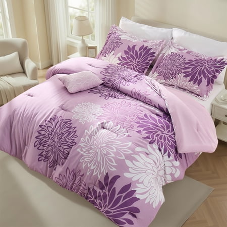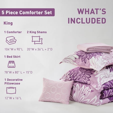 Whether it is the energetic tones or soothing neutral bedding options that you are looking for Regency Heights has a product that has the best of both the worlds. The 5-piece Floral Printed Comforter Set in purple adds a fun element to your whole bedroom ensemble. The pleasant combination is sure to heighten your excitement. This 5 piece comforter set features a bold, colorful floral design to turn your bedroom into favorite getaway. With the Regency Heights' latest collection featuring modern and nature-inspired patterns, is better for you, your family, and the planet. It's offered available sizes: Queen and King.