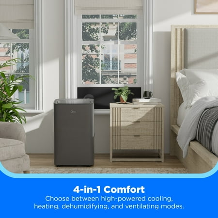 The new Midea 10,000 BTU (13,500 BTU ASHRAE) Smart Portable Air Conditioner with Heat model MAP10HS1XWGR-T will keep you feeling cool all summer long and keep you warm throughout the fall and spring with supplemental heat. With multi-season comfort, this unit cools, ventilates, dehumidifies, and heats a space up to 450 Sq. Ft. With multiple cooling modes, fan speeds and intelligent features such as sleep mode and the 24-hour programmable timer, you can personalize your comfort to match your cooling needs. This unit is very easy to use with the digital display and included remote control. This Portable AC can also be controlled from anywhere with the SmartHome app. Enjoy hands-free voice control when paired with Alexa and Google Assistant devices. With the 4-wheel portable design, you can easily move this unit from room-to-room. This unit requires external venting through your window. Easily install in casement or vertical sliding windows with the included installation kit. This unit comes with a 1-year limited warranty.