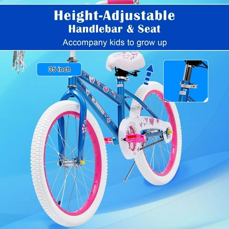 This unique 20-inch bike for girls boasts eye-catching blue and pink colors adorned with charming heart-shaped patterns. The bicycle exudes a vibrant and playful style with its lively blue and white hues that boldly contrast against the steel-blue frame. The comfortably padded seat and the fully decorated handlebar pad complement the overall design beautifully. Additionally, your child is sure to fall in love with the sparkling streamers that gracefully flutter as she pedals. Exclusively from HONGGE, this bike is quick and easy to assemble, requiring just three simple steps: First, insert the handlebar and fork and securely tighten the bolt. Second, fold out the pedals until they click into place. Finally, insert the seat and tighten the quick-release clamp. In just a matter of minutes, your child will be ready to enjoy this fabulous 20-inch HONGGE girls' bike.