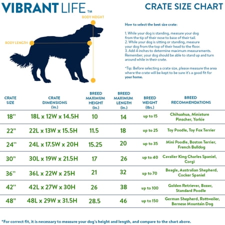 Keep your pet secure with the Vibrant Life Single-Door Folding Dog Crate with Divider. It features a heavy-duty, non-corrosive steel frame and a 36-inch door with locking latches to prevent your animal from escaping. The open wire construction offers visibility and ventilation for your furry friend while the removable floor provides a smooth surface for your dog to enjoy food, water, toys, and treats on while inside. When not in use, it folds flat for compact storage and transport. This kennel can accommodate large dogs up to 70 pounds and is suitable for house training and creating a comfortable, den-like space while you're away at work or traveling. Keep your dog safe with the Vibrant Life Single-Door Folding Dog Crate with Divider.Help your pets live the Vibrant Life! Our products are specially crafted with one goal in mind, seeing your pet at its very best. With a variety of offerings designed to keep animals healthy, happy and energized, Vibrant Life stands out as the brand that truly puts your pet first.