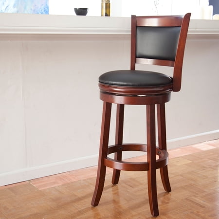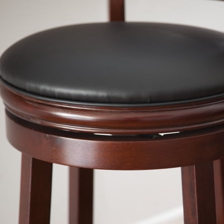 Add comfort and style to your home with this Augusta Swivel Bar Stool. Its frame is constructed of solid RTA hardwood. The seat on this 29" bar stool is made from high-density FR foam and covered with rich-looking, durable faux leather. A sturdy footrest adds comfort while elegantly flared legs contribute to this chair's classic overall appearance. The cappuccino finish of this sleek Augusta bar stool would work well with a wide variety of decors. A seat band effectively hides the swivel mechanism to give this stool a more finished look. This impressive 29" bar stool also features steel ball bearings for a smooth swivel, a sturdy PVC seat and back and classic detailing. Some assembly is required. The Augusta Swivel Bar Stool would look great in a bar area or kitchen. It could also be paired with a high pub table (sold separately) and serve as a kitchen chair in a small apartment.